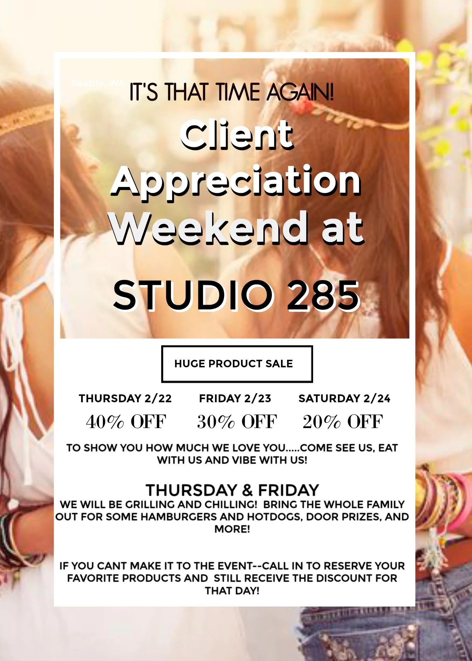 We have a great weekend planned ahead for our dear clients at Studio 285. Most importantly, it's spread out over the course of 3 days! Thursday will be our largest product sale, so don't miss that!